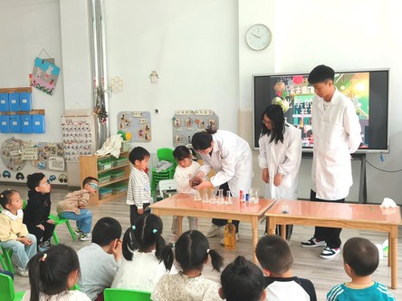 志愿者们在演出过程中,先后展示了“蓝晶雨”“水中花园”“化学彩虹”等奇妙的化学实验,小朋友们对于紫甘蓝的颜色变化尤其感兴趣,志愿者也邀请小朋友们一起上台完成“化学彩虹”实验。通过有趣的剧情和奇妙的实验现象,孩子们体会到了化学的乐趣,科学的种子在小朋友们的心中悄悄萌芽。