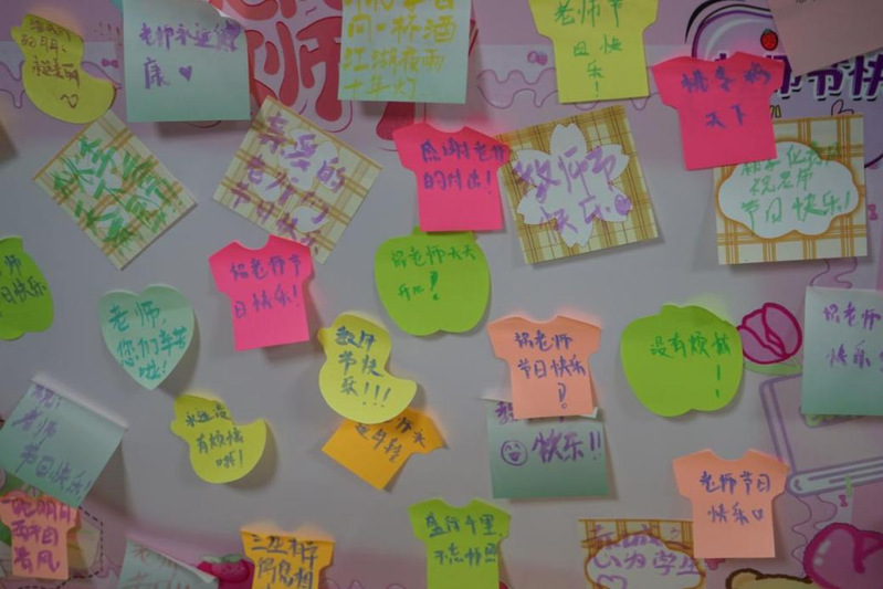 同学们根据心中所想,纷纷在便利贴上书写对老师们的深情祝福。便利贴的内容和形式丰富多彩,既有赞颂师德师风的诗篇,也有提醒老师注意身体的温馨漫画,每一张便利贴都承载了学子们对老师的深厚情感。