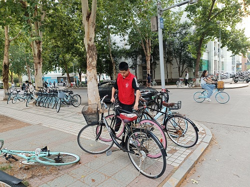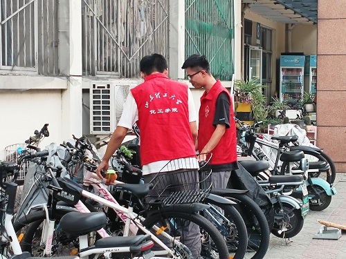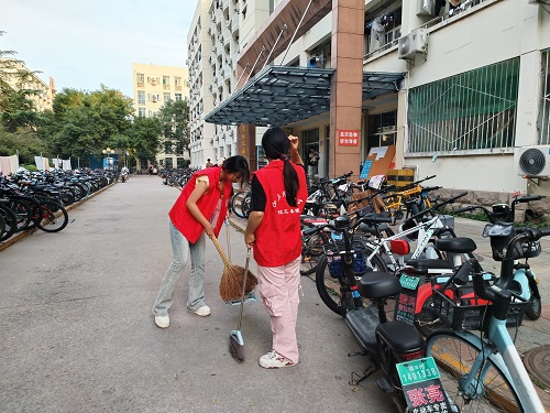随后,同学们迅速转移至七八号公寓楼前,投身于井然有序的志愿清洁行动之中。他们手执扫帚、簸箕等清洁器具,对宿舍楼前的每个角落进行了全面而细致的清扫。在同学们的共同努力下,垃圾被一一清除,地面重归洁净,焕然一新。同时,他们还细心地将原本杂乱无章的车辆逐一归位,排列得整整齐齐,使得公寓楼前的环境变得整洁有序。