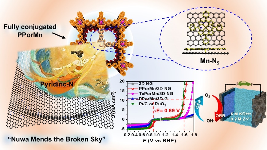 该工作成功合成了具有高热稳定性全共轭PPorMn的COF结构。利用Pyridine-N结构的氮掺杂三维石墨烯(3D-NG)锚定PPorMn,形成Mn-Pyridine N桥键作为“电子泵”,不断地将电子从3D-NG转移到Mn-N5位点,从而提高PPorMn/3D-NG的氧催化活性。PPorMn/3D-NG的催化性能优于之前的研究。这项工作探索了Mn-N5结构的电子传递机制,为设计高效的全共轭COF类双功能氧催化剂提供了支持。