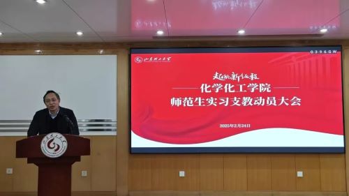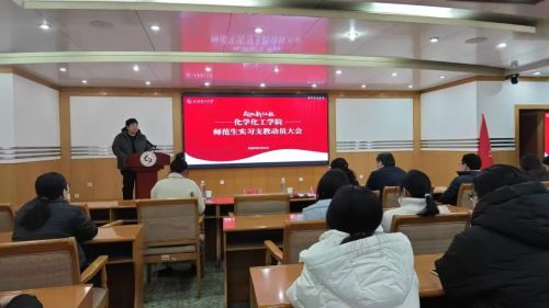 此次动员大会由公司副经理黄昊飞主持,淄博市柳泉中学教科研处主任聂隽、化学化工公司党委书记王介忠、团委书记兼学工办主任曹晓媛、化学教育系主任周振以及辅导员闫洪月等出席,全体教育实习指导教师与2022级化学师范专业员工参加。