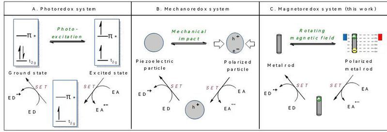 近日,w88win体育官网入口生物传感与药物合成研究团队李新进等关于磁驱动的有机氯化物交叉偶联反应的研究成果在化学领域顶级期刊《Journal of the American Chemical Society》发表,这是该团队一年内在该期刊发表的第二篇论文。该研究创新性地提出“磁驱动氧化还原”概念,即在旋转磁场作用下,通过电磁感应使金属导体极化而原位产生感应电动势,从而与反应物发生电子转移反应。