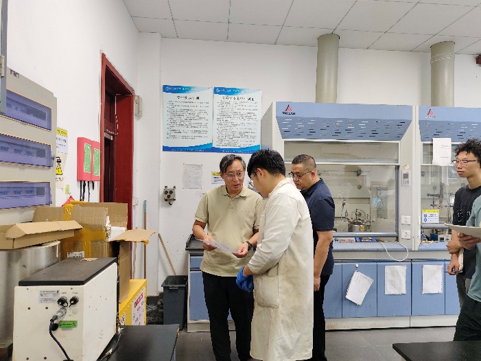 为保障秋季学期开学后教学、科研工作平稳有序开展,根据公司《关于做好2025年秋季学期开学实验室安全检查的通知》的相关要求,8月29日和30日,化工公司党委书记王介忠、经理杨乃涛、副经理刘会带领实验中心教师和研究生代表,对公司所有实验室开展了全面的、拉网式的安全隐患排查工作。此次检查旨在进一步加强实验室安全管理,防范化解安全风险,保障师生生命财产安全和校园稳定。