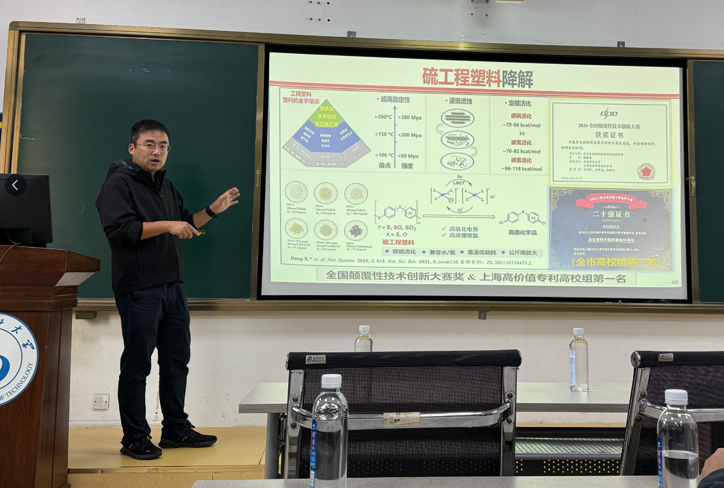姜教授进一步分享了其在“拟肽策略”方面的突破性进展,该策略为靶向药物开发与生物分子定向合成提供了高效灵活的新工具,不仅显著提升合成效率、减少有机废弃物,也为药物代谢研究、癌症治疗与细胞再生等领域提供了绿色、可行的解决方案。他还介绍了团队在“硫工程塑料降解”“AI for Chemistry”及“光电仪器开发与应用”等方面的系列研究成果。
