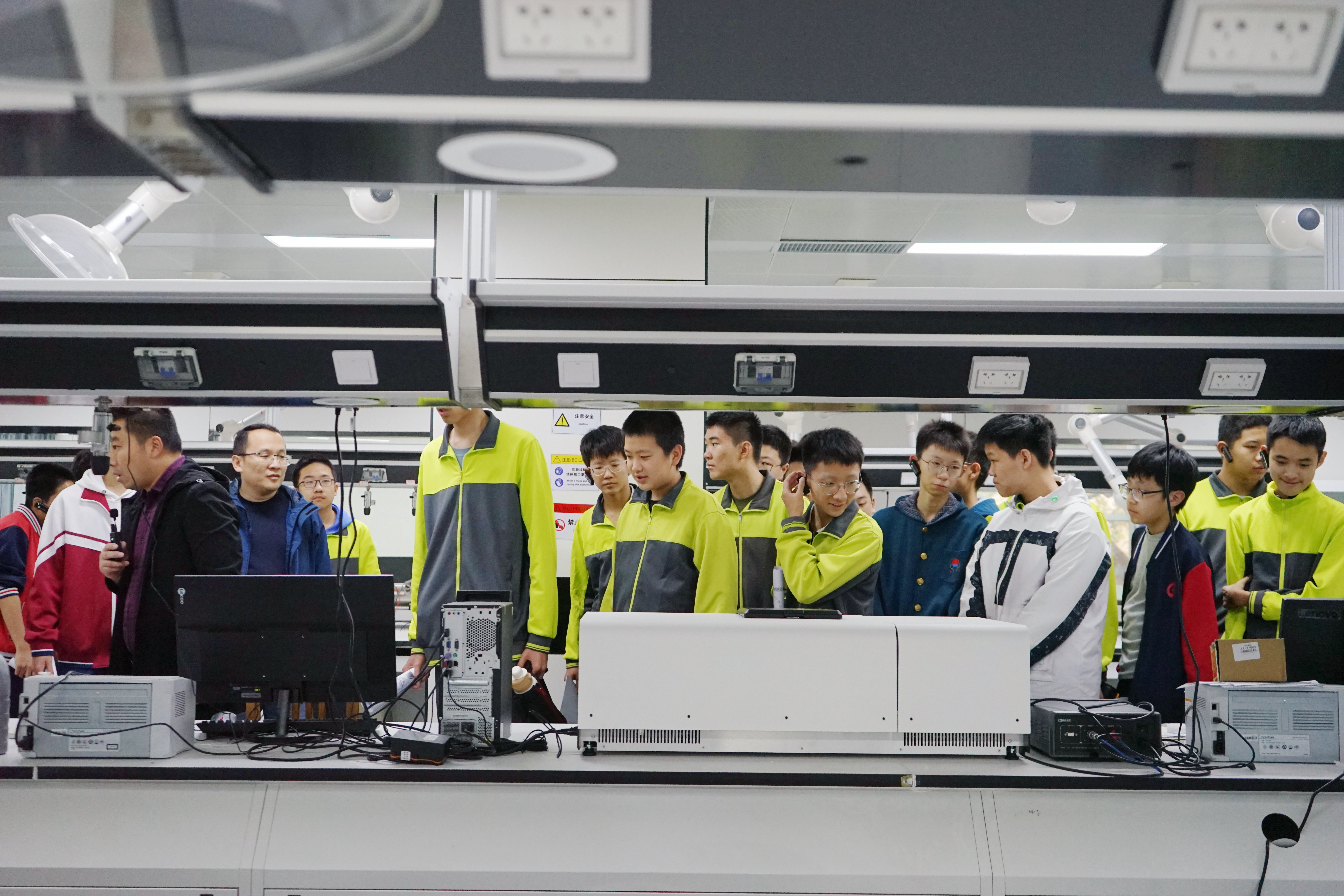 活动伊始,化学教育系主任周振介绍了四号实验楼的结构布局和实验室的发展历程。随后,公司实验中心党支部书记牛学良带领师生到公司大型科学仪器测试平台依次参观了X射线衍射仪、热重分析仪、LB膜测试仪、台式扫描电镜、核磁仪、物理吸附仪等高端仪器,分享化学相关前沿科学知识。师生走进无机化学、有机化学、分析化学、物理化学基础实验室,牛学良针对各实验室的基本情况和功能、实验原理及流程、仪器设备的使用方法与作用等进行了详细介绍。
